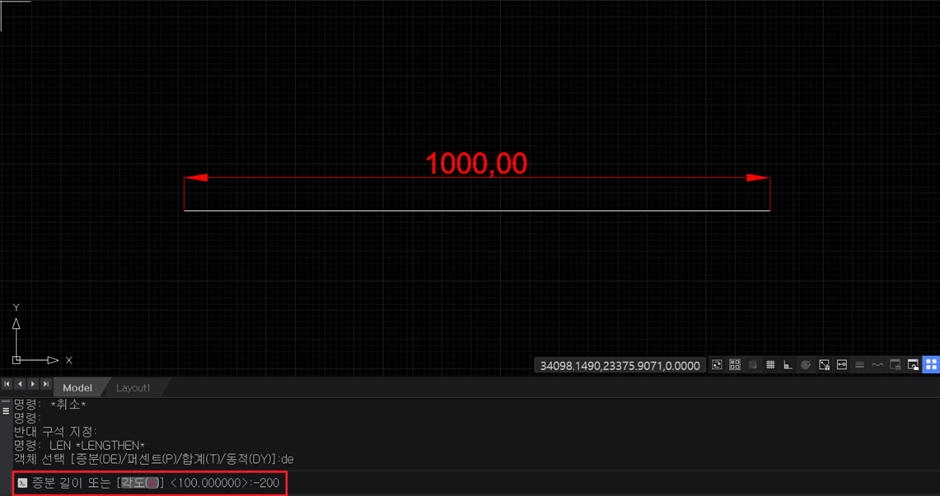 여기서, 길이를 늘리는 것만 가능한 것이 아닌 길이를 줄이는 것도 가능한데요. 방법은 간단합니다. 앞에서 [Len 명령어]를 입력하고 [DE]를 입력한 다음 줄이고 싶은 치수 앞에 ‘– 부호’를 입력한다면 길이가 원하는 만큼 줄어듭니다.
