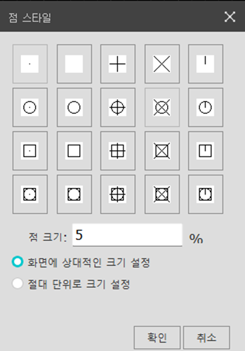 하지만 객체를 클릭해도 분할된 점이 보이지 않는다면 명령어 DDPTYPE을 이용해 점 객체의 스타일을 설정해주어야 합니다. 점의 크기와 절대 단위 혹은 화면에 상대적인 크기도 설정할 수 있습니다. 이 때 되도록이면 크고 잘 보이는 점으로 설정해야 분할된 점들에 블록을 삽입하기가 편해집니다!