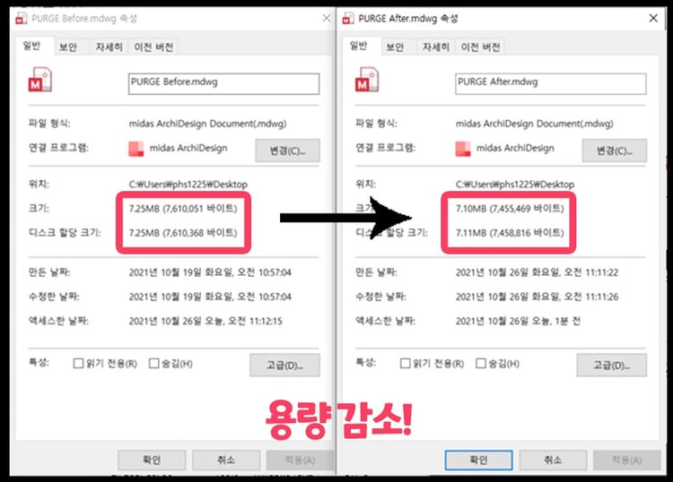 상단의 이미지는 같은 파일을 PURGE 한 전과 후의 용량 변화를 보여주는 이미지입니다. 확실 용량의 크기가 줄어드는 것을 확인할 수가 있는데요. 사용하는 파일에 따라 줄어드는 용량이 크기가 천차만별이겠지만, 확실히 줄어드는 것을 확인하실 수 있을 거예요.