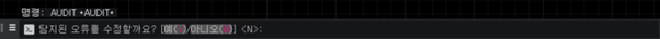 AUDIT 명령어는 현재 사용하고 있는 dwg 파일 내 객체들의 오류를 수정해주는 명령어입니다. 단축명령어 AUDIT를 입력하면 ‘탐지된 오류를 수정할까요?’라는 문구가 표기됩니다.