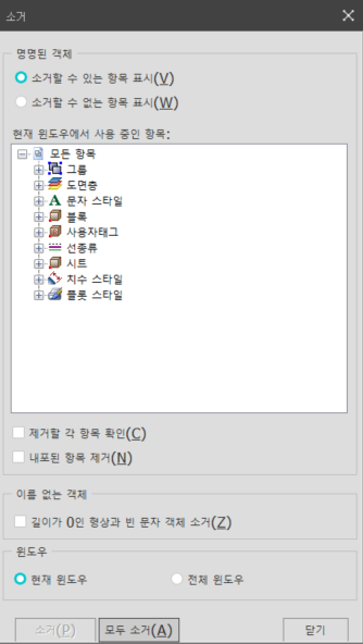 단축 명령어 PURGE 입력 후. 필요에 따라 모두 소거 혹은 지우고 싶은 항목을 선택 후 소거를 진행하시면 됩니다.