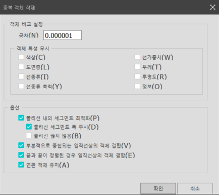 이와 같은 문제를 해결해 줄 수 있는 명령어가 바로 ‘OVERKILL’입니다. 단축 명령어 ‘OVERKILL’을 입력 하면 중첩된 선이 있는 객체를 선택합니다. 선택하게 되면 하단과 같은 ‘중복 객체 삭제’라는 팝업 창이 표시되게 됩니다. 중간의 ‘객체 특성 무시’ 항목에 사용자가 원하는 설정 값을 체크 후, 확인 버튼을 클릭하게 되면, 중첩된 선이 삭제되며 간단하게 중복 객체를 최소화하실 수 있을 거예요.