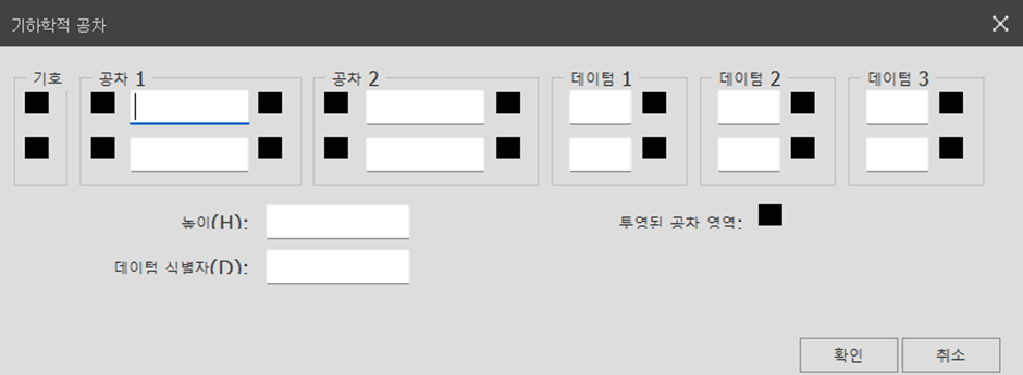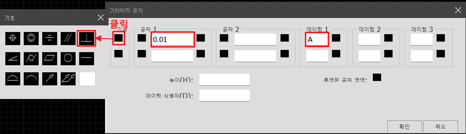 이때 예시로 [직각도 A 기준으로 0.01에 맞추어라] 라고 한다면 '기호'에는 ‘ㅗ’ / '공차1'에는 ‘0.01’ / '데이텀1'에는 ‘A’를 입력해주면 되겠죠
