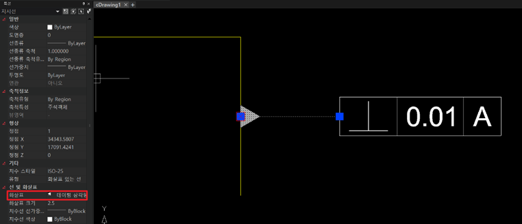 먼저 LEADER 명령어를 입력하고 화살표를 만들어줍니다. 그 후 화살표 객체를 선택해 특성창(F1)에서 '화살표'를 눌러 드롭 다운한 후 '데이텀 삼각형 채우기'를 눌러주시면, 아래와 같이 데이텀 화살표로 변경하실 수 있습니다.