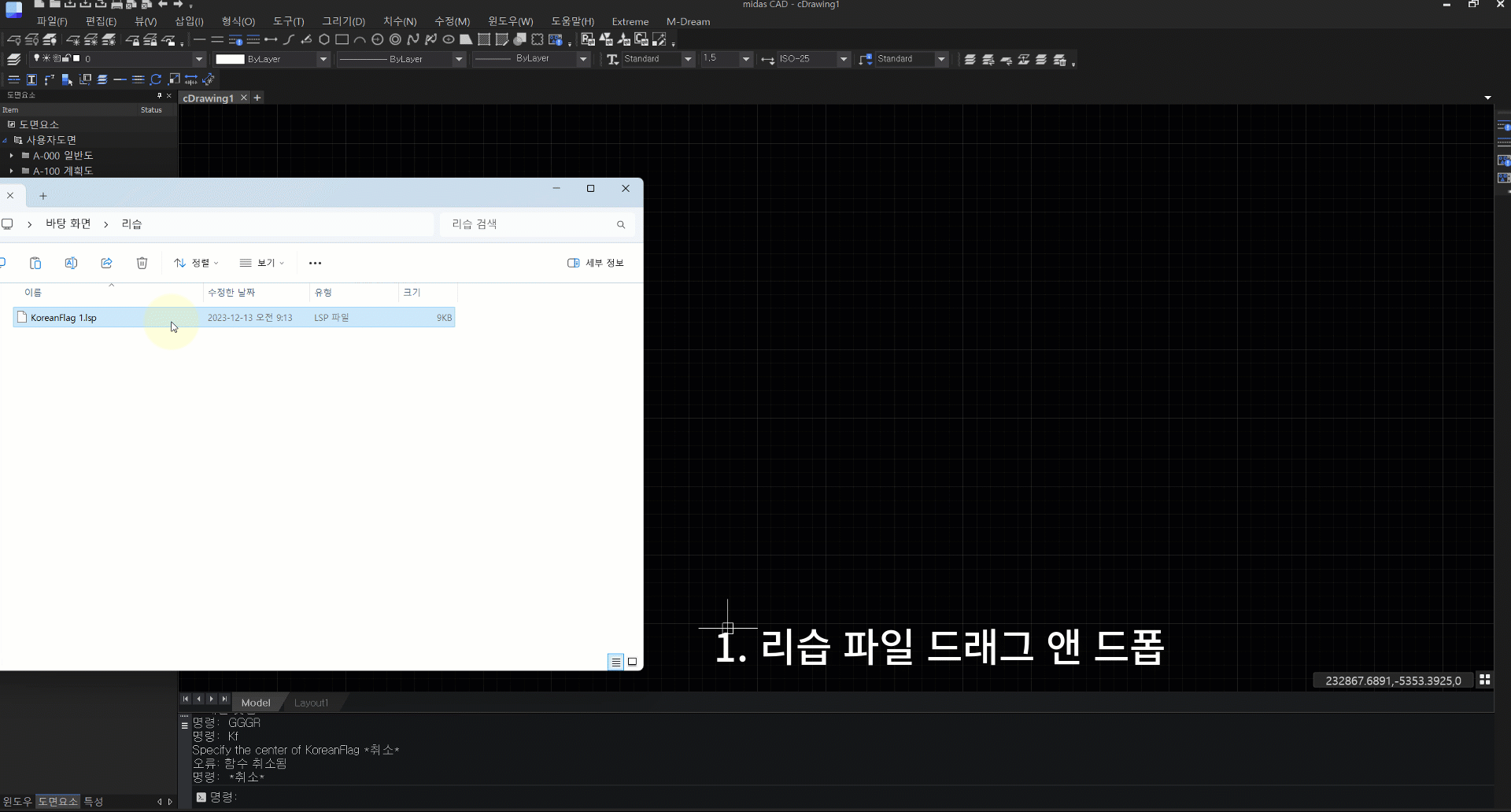 흔히 리습은, 캐드를 사용할 때 반복적인 작업을 단순화해서 생산성을 높여주곤 하는데요. 정교하게 태극기를 그리는 작업도 리습이 있다면 위의 영상처럼 단 3초만에 태극기를 그릴 수가 있습니다. Lisp 언어는 프로그래밍 언어 중에서 배우고 익히기가 쉬운 편에 속해서, 실무자들 중에서도 리습을 많이 제작하고 배포됩니다. 또한 리습은 캐드만 있으면 적용하기도 매우 쉬워서 많은 사랑을 받곤 합니다.