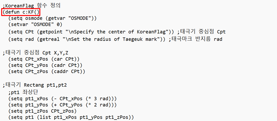 하지만 리습을 다운 받았는데, 명령어를 모르겠다. 라고 하시는 분들이 있을 것 같아 방법을 알려드립니다. 먼저 다운받으신 리습을 오른쪽 마우스 클릭한 후, 연결 프로그램으로 메모장을 클릭합니다. 그 중에서 defun c: 라는 부분을 찾은 후 그 다음에 있는 단어가 명령어입니다. 위 리습의 경우 명령어는 ‘KF’ 라고 보면 되겠습니다. 위의 태극기 그리는 리습도 마이다스캐드에서 자체 개발한 리습인데요. 계속해서 자체적으로 사용자들의 편의를 위해 lisp을 개발하고 있습니다.